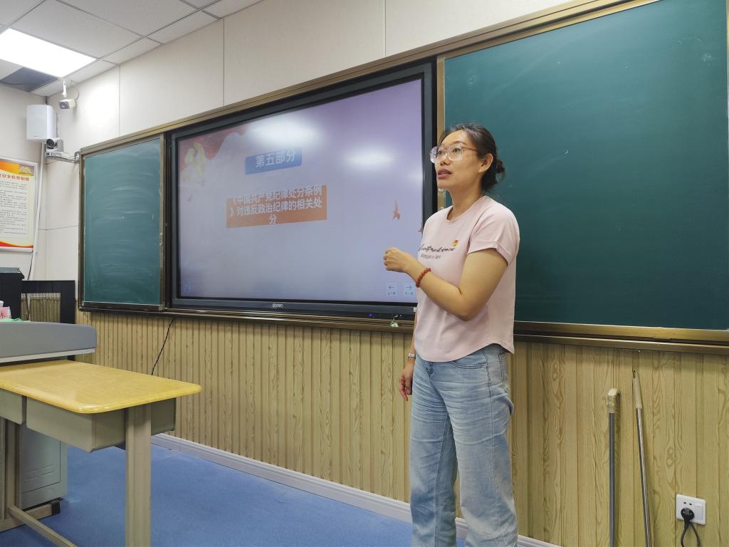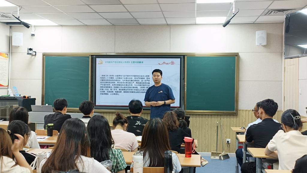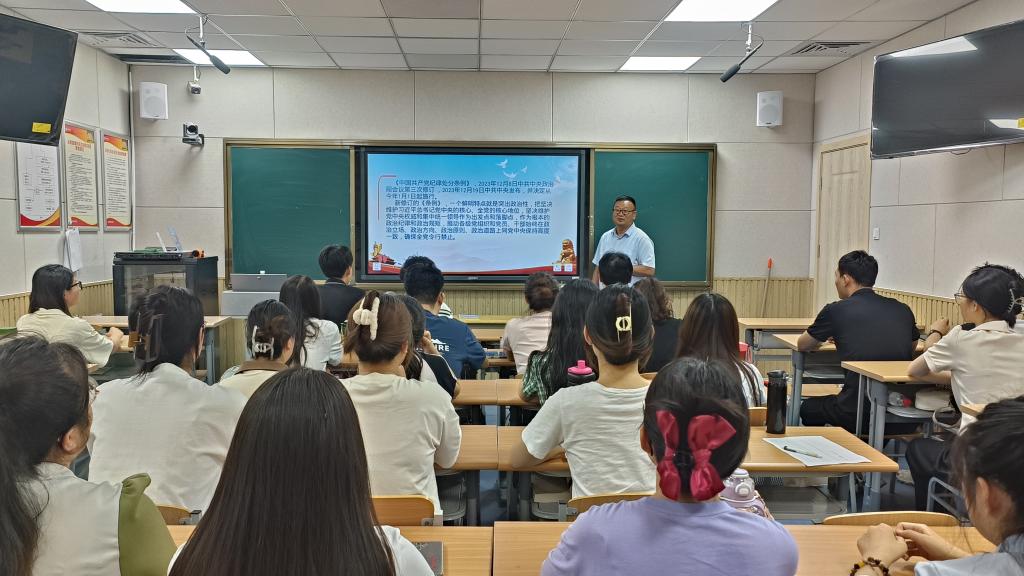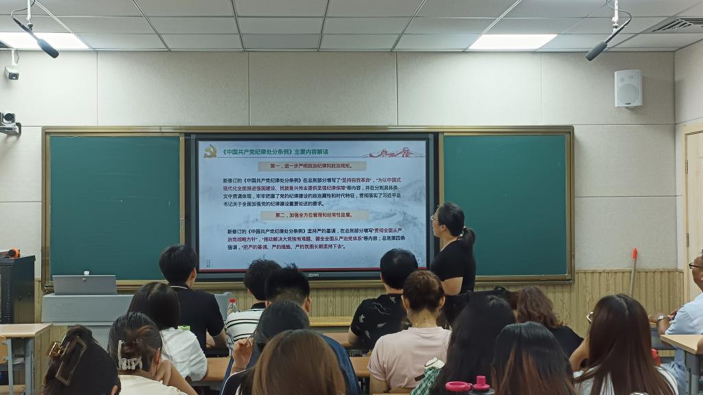 我院党委书记杨爱民为师生党员讲授了第一讲《中国共产党纪律处分条例》的制定、颁布和修订以及学习心得,第一教师党支部书记孙聘讲解了新修订《中国共产党纪律处分条例》重要意义,第二教师党支部代书记肖杨杨讲解了《中国共产党纪律处分条例》的特点和看点,第一学生党支部书记闵令珍讲解了《中国共产党纪律处分条例》总则主要内容,第二学生党支部书记崔弘讲解了《中国共产党纪律处分条例》违反政治纪律的相关处分,第三学生党支部书记颜子凡讲课题目是:认真学习贯彻《中国共产党纪律处分条例》。