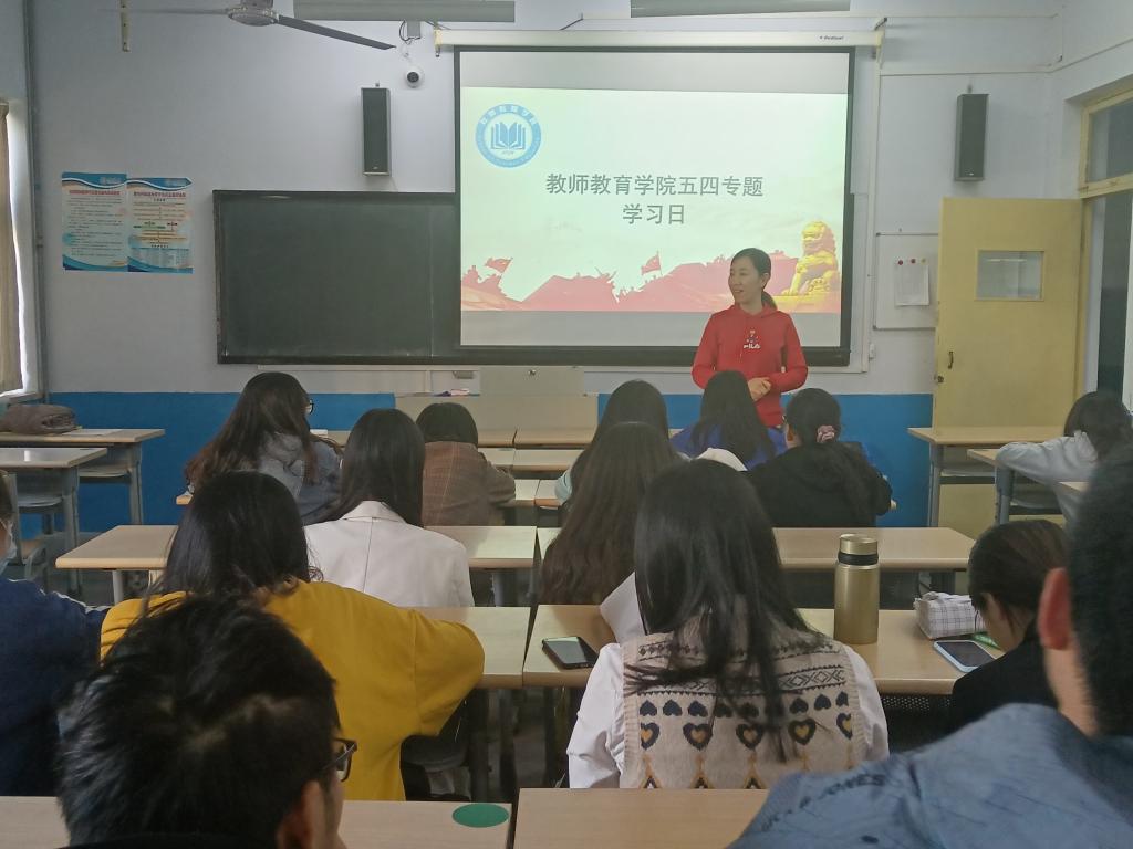 活动伊始,教师教育学院团总支书记闵令珍同志以五四精神为主题,向大家分享了一堂生动的五四专题团课。闵令珍同志结合自身学习党史、新中国史、改革开放史、社会主义发展史,围绕时刻不忘感党恩一心一意跟党走,从坚定理想信念,时刻不忘知党史、补足精神之钙,时刻不忘感党恩、践行初心使命,一心一意跟党走三个方面讲述了广大青年学子在党的不同历史时期所担负的历史使命和时代责任。同时,阐述了“五四”精神的新时代内涵,激励青年学生要树立远大理想,担当时代责任,勇于砥砺奋斗,练就过硬本领,不断学习提升,成为有理想、有担当、有本领的青年一代。