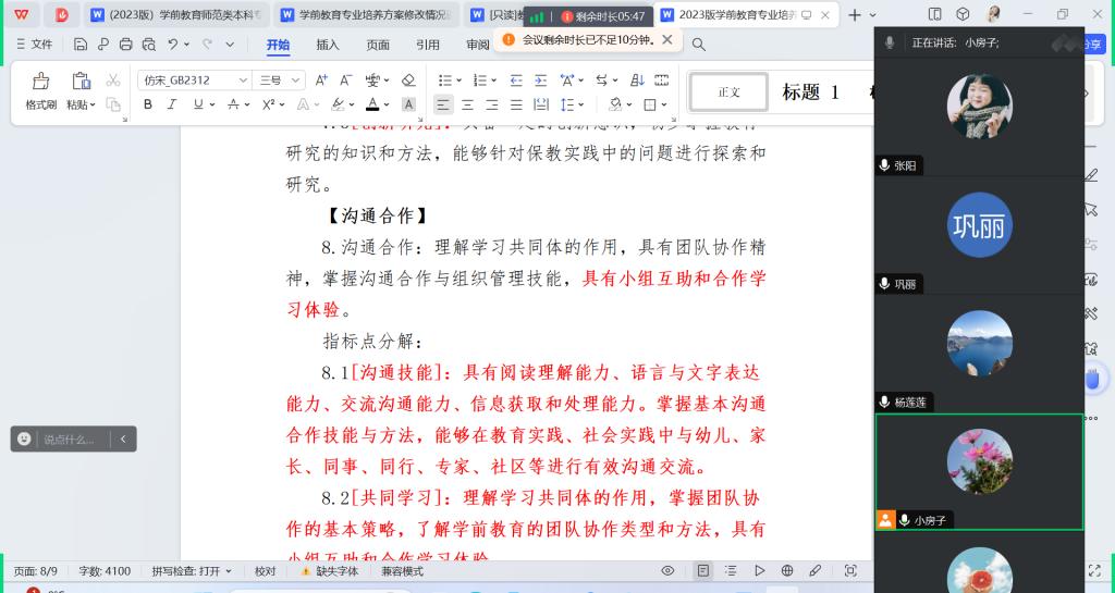 2023年6月25日,教师教育学院举行学前教育专业人才培养方案修订研讨会,针对2023版人才培养方案的修订进行了研讨。本次人才培养方案修订是在对照学前教育专业师范专业认证过程中专家整改建议的基础上进行的,我院对培养方案的培养目标、毕业要求、课程安排情况等进行了修订。后期还会对修订结果请校内外专家及一线教师进行论证。参与本次人才培养方案修订研讨会的有教师教育学院相关领导、系主任等,本次研讨会通过腾讯会议在线上进行。