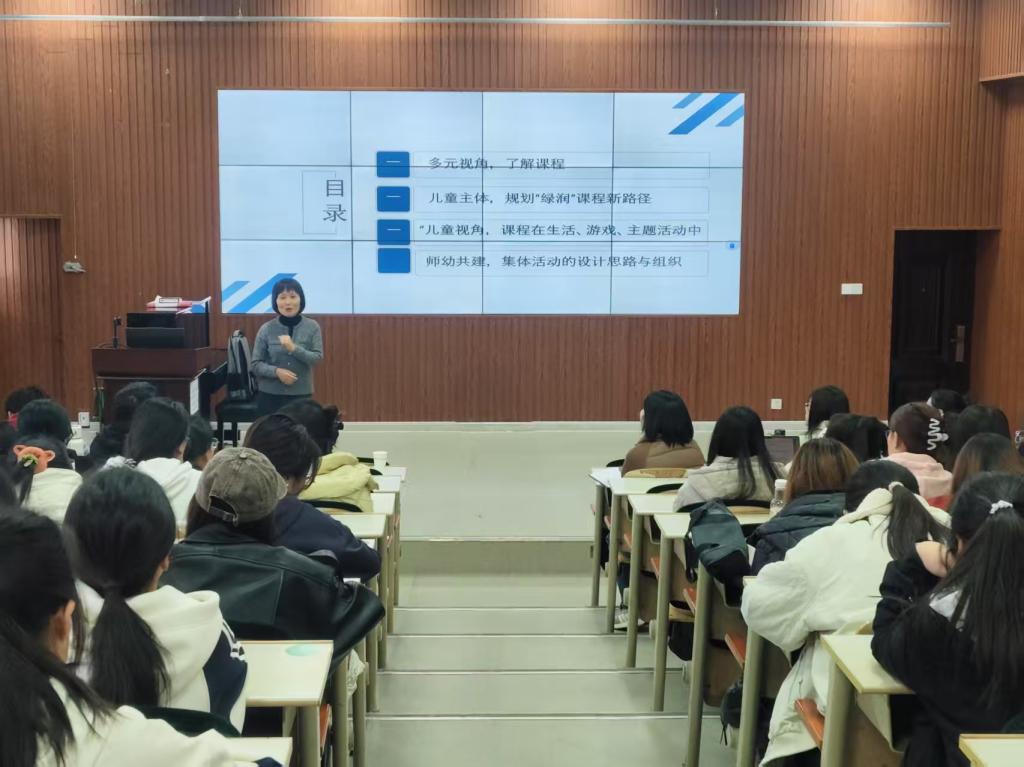 3月18日下午,教师教育学院举办了一场主题为“关注童视角,探寻育本真——‘绿润’课程的组织与实施”的专题讲座。本次讲座特邀妇女儿童活动中心曹志敏园长担任主讲嘉宾,学院学前教育专业师生到场聆听。