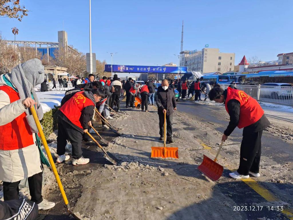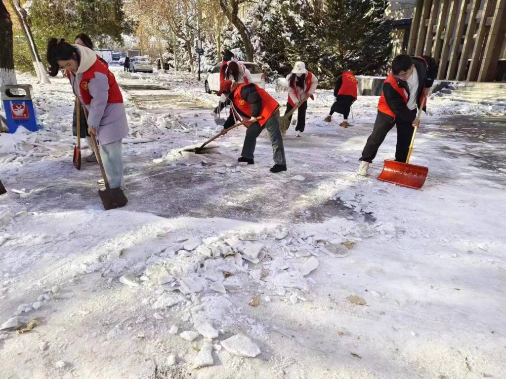 寒潮来袭,德城区迎来大雪,随着降雪量的持续增大,校园多地出现积雪、结冰现象。为保证师生出行的便利,维护正常的教学秩序,志愿者们克服困难,积极主动地加入到扫雪活动中。由于过往行人和车辆的来回走动和碾压,冰雪紧紧附着在地面上,加剧了清扫的难度。但是这丝毫没有影响志愿者的热情和工作效率,他们利用铁锨、扫把等工具,相互配合,最终在大家的共同努力下,校园内的积雪被迅速清除,道路变得畅通无阻。