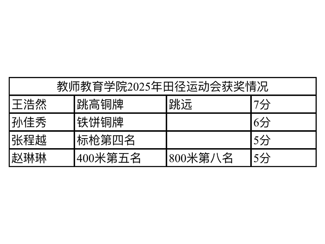 运动员们在赛场上挥洒青春热血,用拼搏诠释青春。短跑赛道上,运动员们风驰电掣般冲向终点;长跑比赛中,运动员凭借顽强的毅力和坚韧的耐力,一步一步向着终点迈进;跳高、跳远、铅球等田赛项目的运动员们也不断挑战自我,突破极限。运动员们的每一次起跑、跳跃、投掷,不仅是体能的较量,更是未来教师“坚韧育人”品格的预演。赛场边,观众们的加油声、欢呼声此起彼伏,为运动员们注入了强大的动力。在两天的激烈角逐中,我院健儿屡创佳绩:王浩然在跳高赛场以完美姿态过杆锁定铜牌,转战跳远项目后继续发力,凭借出色表现再创佳绩,最终在整个运动会赛程中累计获得7分;孙佳秀在铁饼比赛中稳扎稳打,以标准旋转动作和强劲爆发力成功摘铜,个人累计获得6分;张程越在标枪赛场全力以赴,经过激烈角逐以5分的高分斩获第四名;赵琳琳在400米比赛中奋勇争先,以顽强毅力收获第五名,随后在800米长跑中稳守节奏,获得第八名的好成绩,个人累计得分达到5分。在其余项目中,我院运动员也展现出顽强拼搏的竞技风采。同时,经过全院师生的共同努力,我院最终荣获最佳表演奖、精神文明奖、体育道德风尚奖三项奖项。