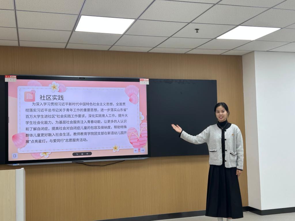 活动中,各团队代表依次上台,以PPT、图片、现场实物展示等形式展示社会实践经历。教师教育学院团支部以“点亮星灯,与爱同行”为主题进行分享,志愿服务团队讲述了在新语特教中心开展活动的所思所想所感,以及志愿者如何通过舞蹈、手部操、做手工等活动充分调动孩子们的积极性。同时,志愿者还分享了在活动过程中如何关注孩子们的情绪变化,如何通过细心和耐心为他们提供全方位的支持和帮助,尊重每个孩子的个性和兴趣,让他们自由创作,鼓励孩子表达自己的情感和想法,努力让每一个孩子的脸上都绽放出自信和快乐的笑容。该团队也呼吁大家让更多的人认识和了解到自闭症,提高了社会对自闭症儿童的包容及接拿程度,帮助特殊群体儿童更好融入社会生活。“手语天使,点亮心灯——听障儿童志愿服务活动”结合专业特色,以专业技能为依托,让同学们走进社区,走进德州市育红听力康复中心,将所学知识融入到社会实践中,通过多样化的教学形式为听障儿童带去快乐。教师教育学院团支部还精心准备了“虫儿飞”手语操,通过学习手语操增强同学们的社会责任感和同理心,实现自身成长发展的同时,带动更多群众关注听障群体,积极参与到更多公益活动中。美术学院“微光”文化志愿服务团代表以“纸艺绘心,刻影华夏”为主题进行分享,以刻纸为载体,带领社区居民亲手制作,领略传统工艺独特的魅力。“百万学子链接十万老人,助力银龄跨越数字鸿沟” 活动负责人为大家分享了活动中志愿者如何与老人们进行面对面交流,如何为他们提供个性化的数字技能培训,并通过PPT耐心细致地为老年人讲解智能手机紧急事件应对措施和解决方案以及网络点餐等实用知识。“掐丝为‘笔’,珐琅为‘彩’”活动负责人为大家分享了活动的宗旨、掐丝珐琅的历史、制作过程以及在活动中的所思所想。美术学院2021级黄佳琪以《成为光》为题,分享了在支教过程中与孩子们的故事,跟学生们建立深厚的情谊,看到孩子们渴望知识的眼神,更加坚定了该生投身教育事业的决心。最后,教师教育学院、美术学院社会实践团队指导老师对各团队实践情况进行了回顾和点评,并提出了进一步优化和改进的建议。