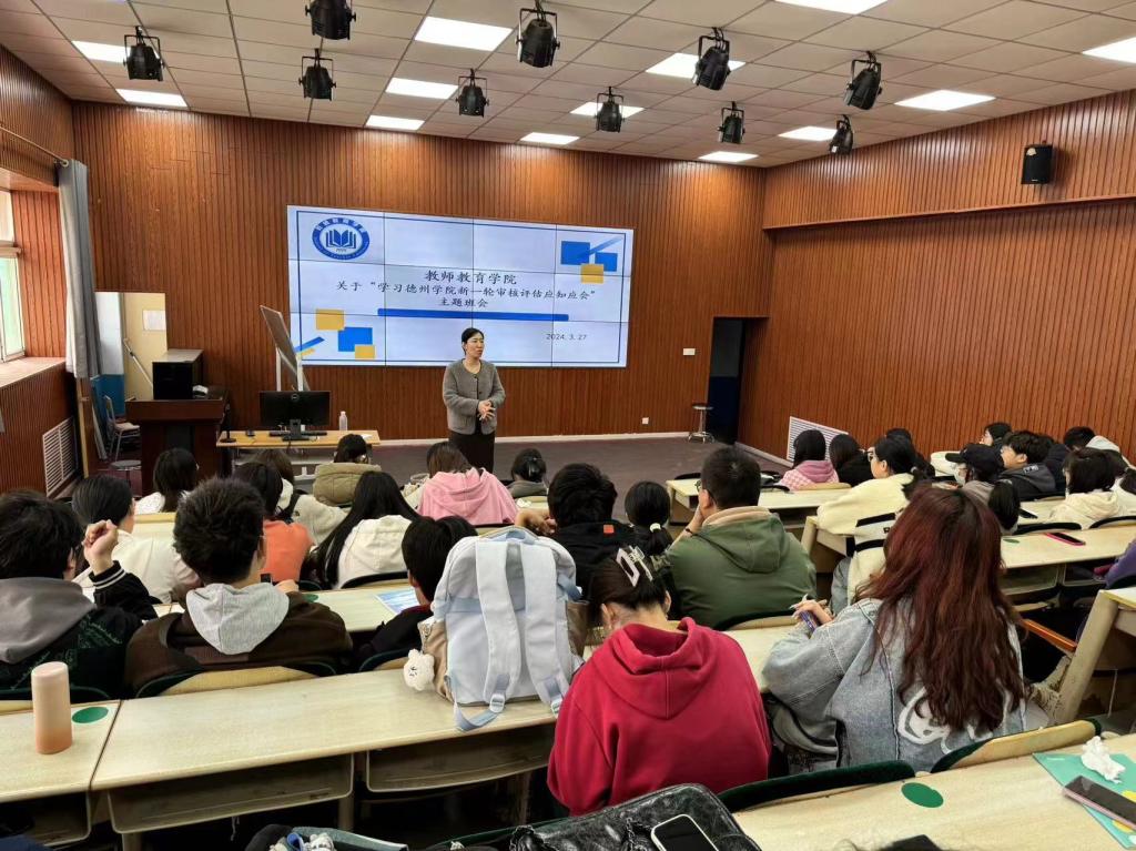 活动前期,教师教育学院组织各班主任集中学习和讨论,结合学院实际情况,从新一轮审核评估的核心要义、学校学院发展历史和自评情况以及教师如何做好迎评冲刺阶段工作等做了深入细致的讲解培训。同时,教师教育学院积极安排各班开展“学习德州学院新一轮审核评估应知应会”主题班会,让师生们更加全面地了解评估标准、评估流程和评估要求,确保每一位学生都能深刻理解评估的重要性和意义,掌握应知应会的内容。此外,为了更好地学习教育教学审核评估知识,教师教育学院还面向全体同学进行教育教学审核评估知识考试,使每一位同学都能正确认识、理解、掌握教育教学审核评估知识,为学院的教学工作注入了新的活力和动力。