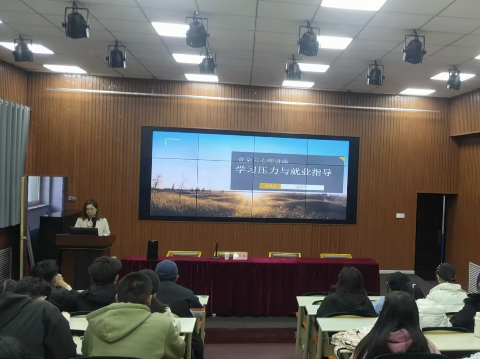 本次讲座邀请到了国家二级心理咨询师蔡莘莘老师担任主讲人。蔡老师首先从常见的典型案例出发,向大家讲述当压力过大时身体会出现的一些症状,以及缓解学习压力、调整心态的简单方法,她还为同学们讲解了积极的心态以及正确的人生观、价值观在自我调节中的重要作用。随后,蔡老师还根据当前就业形势进行了深入分析,为同学们提供了宝贵的就业意见。她建议同学们调整传统的就业观念,积极拓宽就业渠道,提高自身综合素质,以应对日益激烈的就业竞争。在最后的提问答疑环节中,同学们纷纷提出了自己在学习与就业方面的困惑和遇到的问题。蔡老师耐心且细致的解答,不仅使同学们解决了当前的疑惑,更增强了他们对未来职业规划的信心。