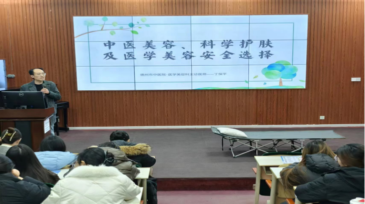 12月17日,为弘扬与传承中医文化,增强师生健康意识和自护能力,德州市中医院医学美容中心主诊医师丁保平和妇产科主治医师姚卫卫受我院邀请,在知行楼113教室举行中医养生和美容健康知识讲座。我院全体女教师和女大学生代表聆听了讲座。
