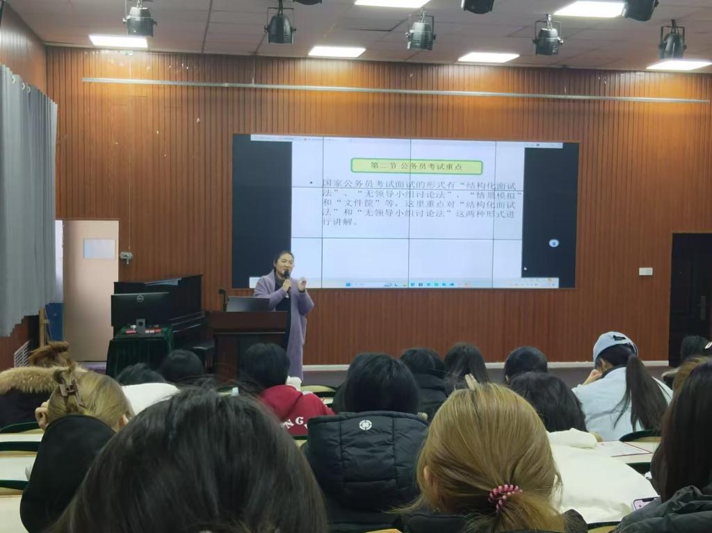 为帮助同学们深入了解考公考编的政策形势、考试要点与备考策略,增强应试信心与能力,提高上岸成功率,实现职业理想规划,教师教育学院于12月24日在知行楼113教室举办“‘职’点未来,‘公’途无量”考公考编专题讲座。