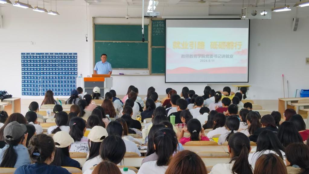 为深入学习贯彻《中共中央 国务院关于弘扬教育家精神 加强新时代高素质专业化教师队伍建设的意见》精神,让教育家精神激励我院2024级新同学坚定教师职业信仰、完善学业与职业规划、夯实未来就业基础,9月11日上午,我院党委书记杨爱民以《初识教师职业与就业》为主题,为新生开讲就业第一课。