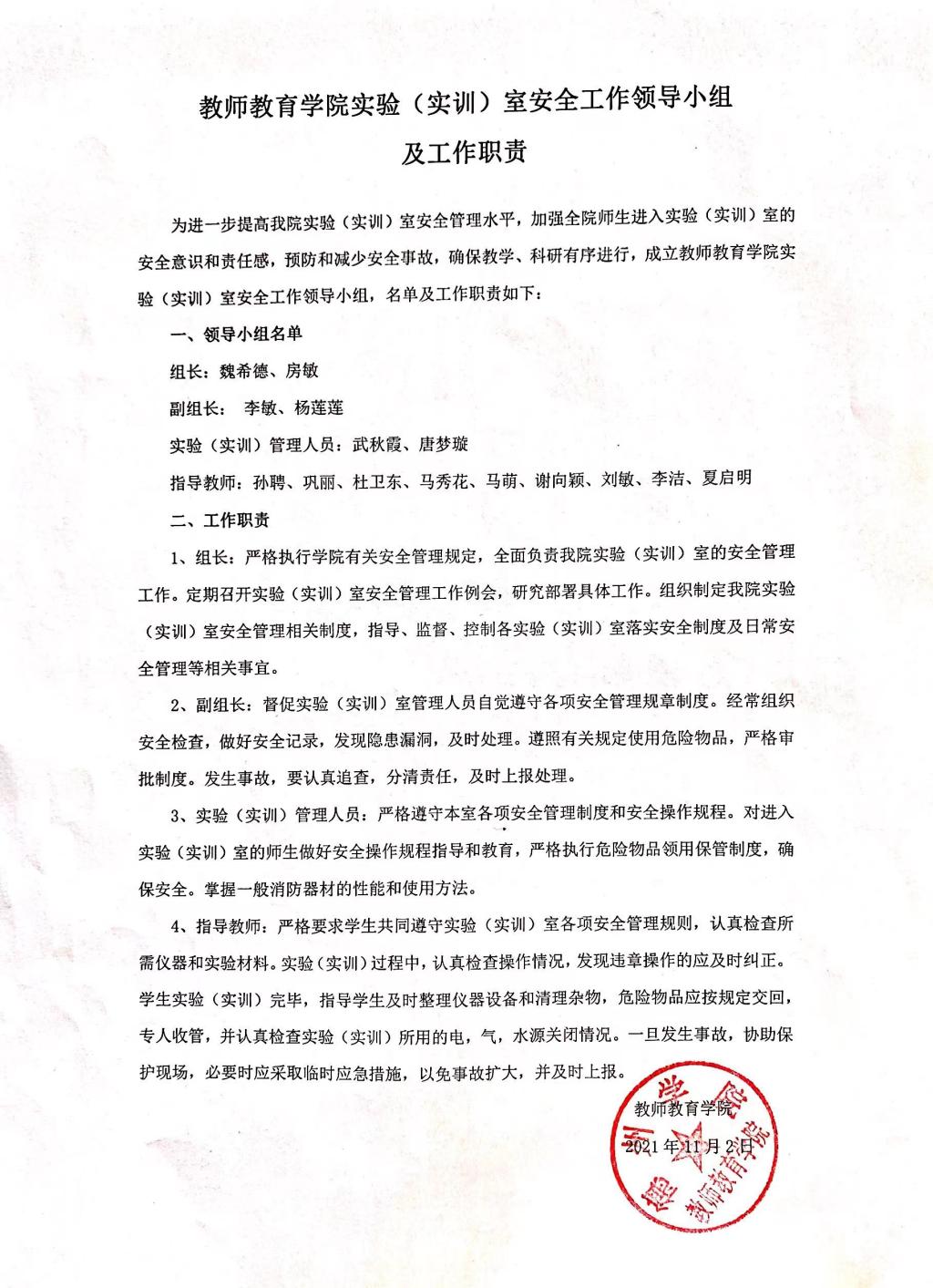 为进一步提高我院实验(实训)室安全管理水平,加强全院师生进入实验(实训)室的安全意识和责任感,预防和减少安全事故,确保教学、科研有序进行,成立教师教育学院实验(实训)室安全工作领导小组,名单及工作职责如下: