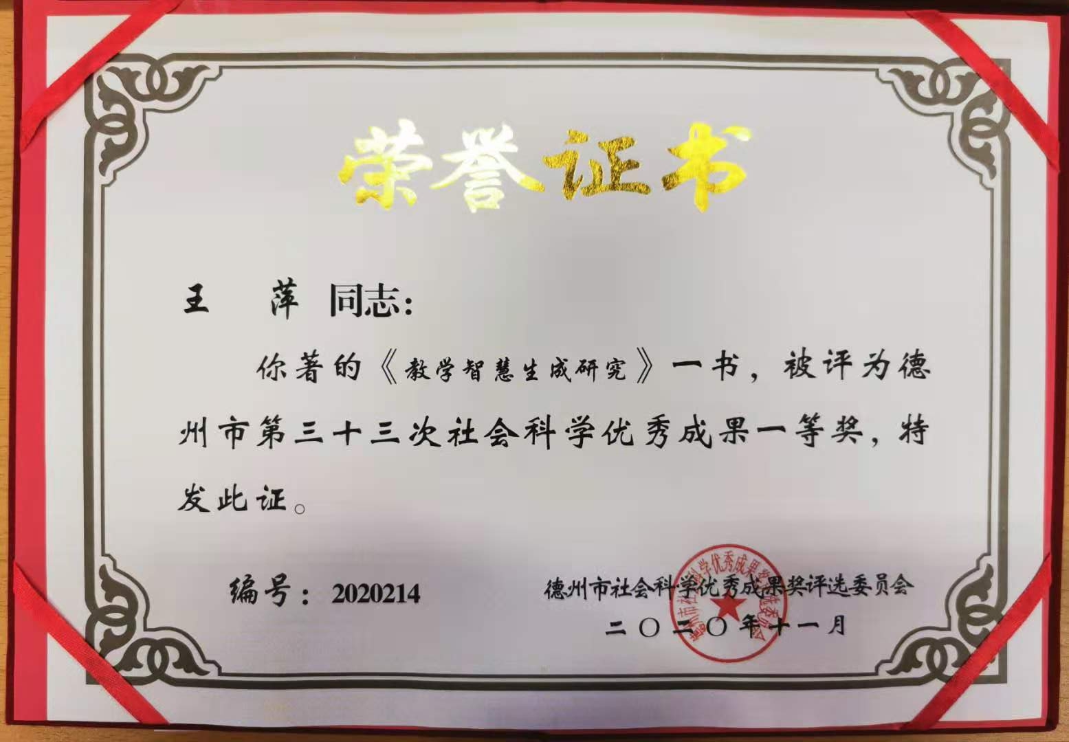 近日,教师教育学院王萍教授专著《教学智慧生成研究》荣获德州市第三十三次社会科学优秀成果一等奖。
