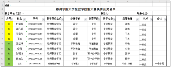 教师教育学院本届德州学院师范生教学技能大赛共有5名同学获得一等奖,4名同学获得二等奖;有资格参加山东省第八届师范生从业技能大赛的有4名推荐选手,3名抽取选手。取得了非常好的大赛成绩,希望这些选手能再省赛中发挥优势,再次取得佳绩!