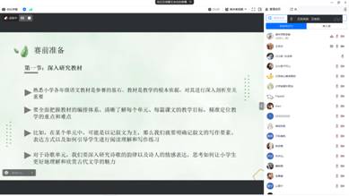 学前教育专业、省赛一等奖获得者黄新媛同学对师范生从业技能大赛的比赛具体流程、个人心路历程等进行了阐述。小学教育专业省赛二、三等奖获得者王依杰、李景睿、陈梦媛、贾濛濛四位同学准备了精美的课件,针对比赛过程中的经验、教训、感悟等进行了分享,为同学们提供了有益的建议。他们鼓励同学们应该摆正学习心态,从提高自身实践能力的角度看待比赛过程中的成功与失误。